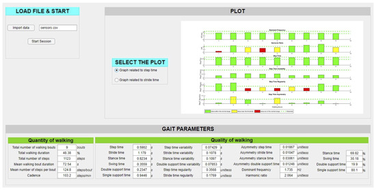Parameters illustrated in Table 1 were directly considered for the final report on the subject’s state of health. Instead, all frequency and temporal measures shown in Table 2 were computed as weighted means before inserting into the final report on the subject’s state of health. They were extracted from each walking window and then averaged, assigning weights proportional to the duration of the walking bout to which they belong. Therefore, a longer bout is more significant than a shorter one and has a greater influence on the final values of the parameters calculated in that window. At the end of this operation, all metrics were collected in the final report that represents a summary of the subjects’ gait characteristics (in terms of quantity and quality of walking) related to motion analysis for the entire recording. As shown in Figure 5, the final report illustrates all the extracted parameters from the proposed algorithm and a histogram for the visualization of the patient status with respect to his standard status condition.