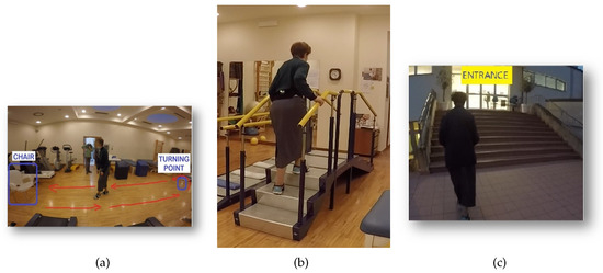 Laboratory trial: (a) Timed Up and Go (TUG) task; (b) Stair task; (c) Free walking task.