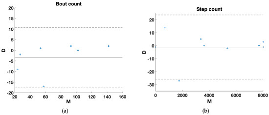 Bland–Altman plots for: (a) bout count; (b) step count. The difference (D) between the algorithm and the video recording as the y–value, and the mean (M) between the two measurements as the x–value. While solid line in each plot represents the mean count difference between the algorithm and video, dashed lines represent 95% limits of agreement.