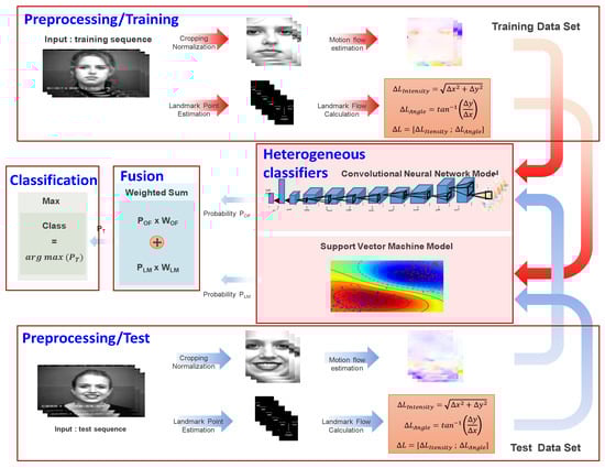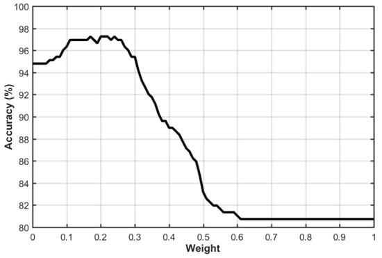 Figure 7 shows the variations in the facial expression classification performance according to the weight values when we combine the modified CNN-based facial expression classification and SVM-based classification using the displacement intensity and angle of facial landmarks.