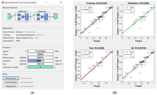 The best ANN structure and window of ANN training (a); the ANN goodness of fit and correlation coefficients R between ANN and output (b) for index RI1.