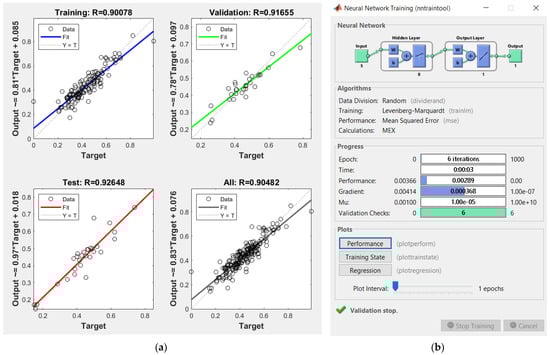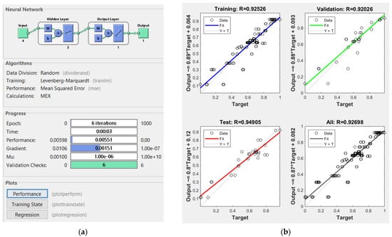 The best ANN structure (a) and the ANN goodness of fit and correlation coefficients R between ANN and output (b) for index RI2.