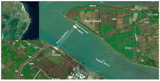 Jurong Yangtze River water intake project is located in Xiashu Town, Jurong City, Jiangsu Province, which includes a water source located on the north side of the main channel of Yangtze River, a water intake artesian pipe across the Yangtze River, and a water intake pumping station, as shown in Figure 1. Taking water from the Yangtze River channel and pumping it to the water plant for processing meets the water demand of Jurong city residents. Two open caissons used as the starting wells for the Yangtze River water intake pipeline are installed within 300 m of the Yangtze River dam. The caisson depth is 46.5 m and the outer diameter is 16 m (as shown in Figure 2). The length of the pipeline from the water source to the pipe jacking wells is approximately 1.4 km, of which the length of the underwater pipeline is 1.3 km.
