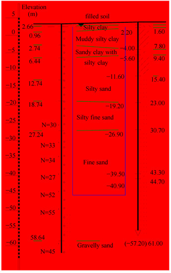 The open caisson is located at a typical river flood plain and river terrace, with soft silty clay in the upper part and a highly permeable sand layer in the lower part. Due to the downward incision of the Yangtze River, the sand layer is connected with the surface water system and is rich in water content. According to the results of field drilling and in situ testing, except the filling in of the shallow part, the soil layer within the exploration depth of 70 m in this survey is widely distributed by Holocene estuarine facies silty clay with gray-yellow soft plastic or slightly dense silt with silty clay, coastal neritic gray flow plastic silty soil, gray silt of slight to medium density, and silty sand (partially mixed with silty clay). The silt, silty sand, and silty clay often interact multiple times. In the deep part of the ground, the soil layer is distributed by Pleistocene marina, neritic or estuarine delta facies gray soft plastic silty clay, and gray-greenish gray with slight to medium density silt or silty sand. A typical stratigraphic profile is shown in Figure 3.
