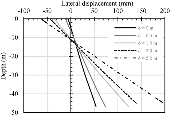 Figure 9 shows the lateral displacement distribution curves along the caisson depth under different disturbance ring thicknesses when the lateral jacking force reaches 1 × 105 kN. It can be seen that because the caisson length-to-diameter ratio is L/D = 3.2, which is similar to the rigid pile under a lateral load, the lateral displacement curve of the caisson along its depth is distributed linearly. In general, the position of the rotating center decreases with the increase in the thickness of the disturbance ring. When the thickness of the disturbance ring δ exceeds 1 m, the rotating center basically stabilizes at about 10 m below the surface, which is about 0.22 times the embedment depth of the caisson.