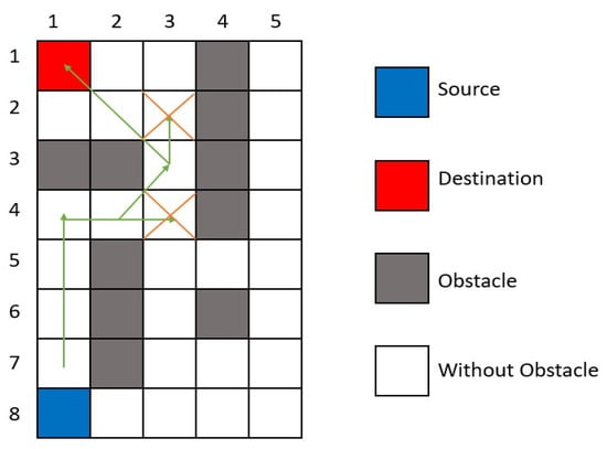 - Zarembo, I.; Kodors, S. Pathfinding Algorithm efficiency analysis in 2D grid. Environment. Technologies. Resources. In Proceedings of the International Scientific and Practical Conference, Rēzekne, Latvia, 20–22 June 2013; Volume 2, pp. 46–50. [CrossRef][Green Version]
