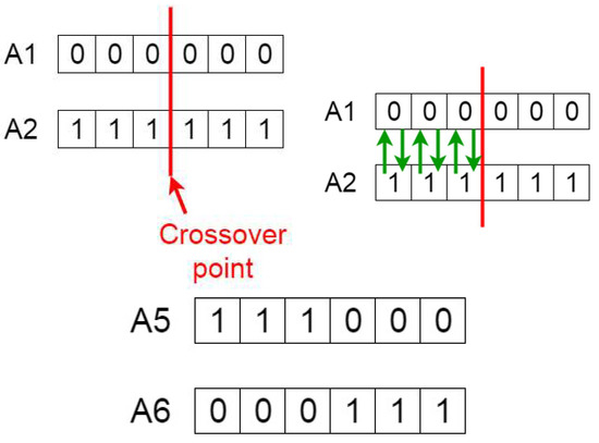 - Crossover: Crossover is the most significant phase in a genetic Algorithm. For each pair of parents to be mated, a crossover point is chosen at random from within the genes. Offspring are created by exchanging the genes of parents among themselves until the crossover point is reached. The new offspring are added to the population as shown in Figure 12 [78].