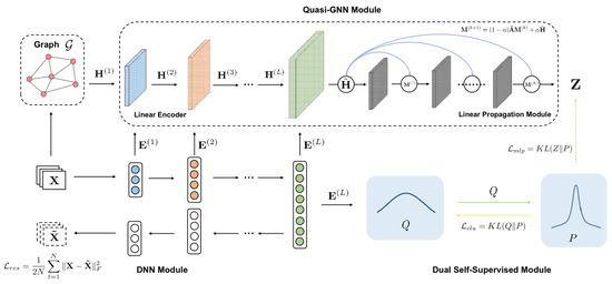 where is the soft clustering frequency. The target distribution normalizes the sum of squares of each distribution in the cluster distribution . By using two distributions to constrain different embeddings, the embedding obtained by the DNN module and the Quasi-GNN module can be considered simultaneously to optimize the embedding and clustering quality jointly. On this basis, we can obtain the corresponding objective function