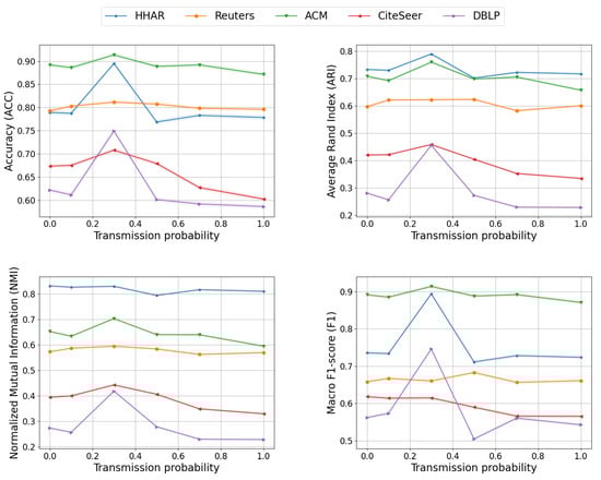 The linear propagation layer adopts the propagation strategy defined by Equation (11). Owing to no parameters, it simply performs linear operations on the original matrix, which greatly improves scalability and reduces computational costs. We set , and 1, respectively, on each dataset, and measure their final clustering effect. In this way, we obtain the most suitable transmission probability setting, and the experimental results are shown in Figure 3. The experimental results generally show a trend of increasing first and then decreasing with the increase in . The transition probability essentially indicates the probability that the target node learns from itself or its neighbor nodes. Based on the experimental results, we can infer that learning from only one of them is not sufficient. Therefore, it is necessary to find a suitable to integrate the information of the target node and its neighbor nodes to obtain the deep embeddings.