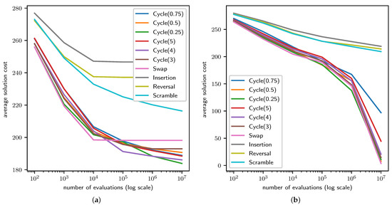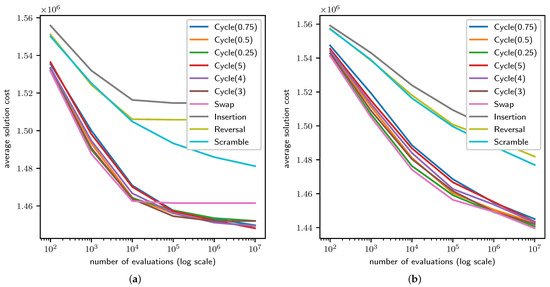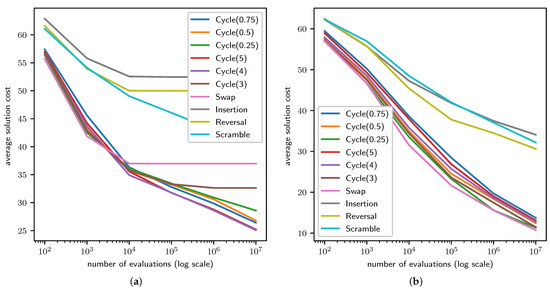 Mutation for permutations is most often one of swap mutation, insertion mutation, reversal mutation, or scramble mutation [15]. There are many permutation crossover operators that focus on maintaining different characteristics of the parents, including order crossover [16], non-wrapping order crossover [17], uniform order-based crossover [18], partially matched crossover [19], uniform partially matched crossover [20], precedence preservative crossover [21], edge assembly crossover [22,23], and cycle crossover (CX) [24].