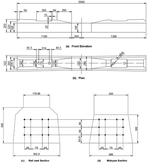 The midspan and rail-seat section of railway sleepers are the most likely sections for cracking to occur [17]. Bakharev and Struble stated that rail-seat cracking is usually caused by abrasion, hydro erosion, hydraulic pressure and freeze-thaw and chemical deterioration [18]. The midspan cracks were often detected in the field due to high impact loading, in which the central section presented the maximum bending moment [19]. Zakeri and Sadeghi studied the vertical loading conditions of prestressed concrete sleepers using specific load-cells between sleepers and the rail and beneath the sleepers [20]. Sadeghi and Barati investigated the rail seat loads, sleeper-ballast contact pressures and sleeper bending capacities of concrete sleepers [21]. These research indicated the analysis of the structural performance of prestressed concrete sleepers at critical sections.