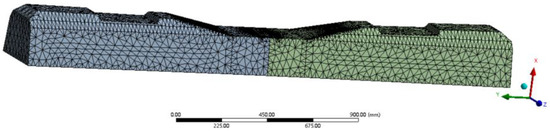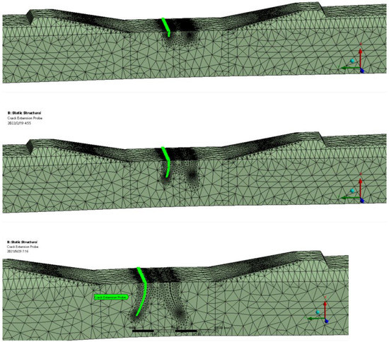 In the experiment, two major cracks were observed at the top fibre of the prestressed concrete sleeper at midspan. Therefore, cracks are created in the small notches on the FE sleeper model according to actual experimental crack positions as shown in Figure 4. The notches are only used for determining crack positions, and the size of notches can be neglected. The notches have no influence on the structural performance of the prestressed concrete sleeper. Crack fronts are specified at the small notches using the node-based named selection. The limit of this simulation is that the crack propagation is symmetrical. Table 3 presents two experimental crack length results, in which the crack length-1 results are selected to compare with the numerical results. Figure 5 presents the simulation of crack propagation in the sleeper model at midspan. A comparison of the crack propagation in the numerical and experimental results is illustrated in Figure 6.