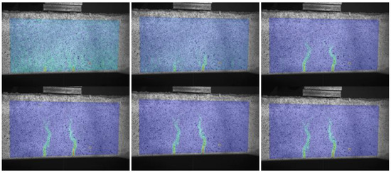 Figure 2 shows the test setup, where two supports are placed at rail-seats and the loading surface is fitted at midspan. The load was transferred from the loading jack to the sleeper. This experiment recorded the loading level from 0 to 140 kN (the ultimate load of normal conventional concrete sleepers at midspan is 140 kN [21]) including the initial crack and crack propagation. The initial crack started to propagate at 45 kN. Figure 3 illustrates crack patterns and propagation, in which the crack was measured using the digital image correlation (DIC) method. An ARAMIS 6 M camera with a resolution of 2752 × 2200 pixels is mounted in front of the prestressed concrete sleeper. The results obtained with the DIC application are more efficient and precise than the microscope to investigate the capacity of prestressed concrete sleepers. Table 3 presents the experimental results of the load-crack length.