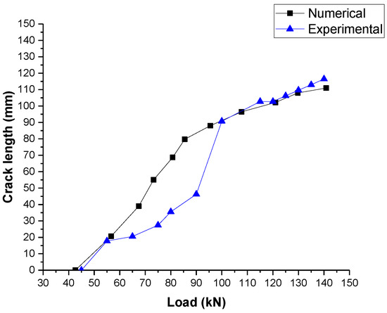Figure 6 presents the comparison of the numerical and experimental results on crack propagation. In the simulation, the trend of crack propagation for numerical results is the closest to experimental results. The numerical model has a good correlation with the initial crack point and ultimate crack point, with the difference being only 6.31 and 4.34% respectively. The crack length of the sleeper model propagates steadily. In the experimental results, crack growth is not uniform between 65 kN and 100 kN. When loading increases from 90 kN to 100 kN, the crack length suddenly increases by 45 mm. This phenomenon was probably caused by the brittleness of concrete. In the simulation, results of crack propagation increase uniformly. In general, the performance of the numerical crack model is validated.
