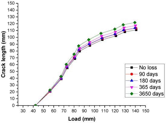 To study crack propagation subject to shrinkage, the load-crack length response for the sleeper due to shrinkage in different time is evaluated as shown in Figure 8.