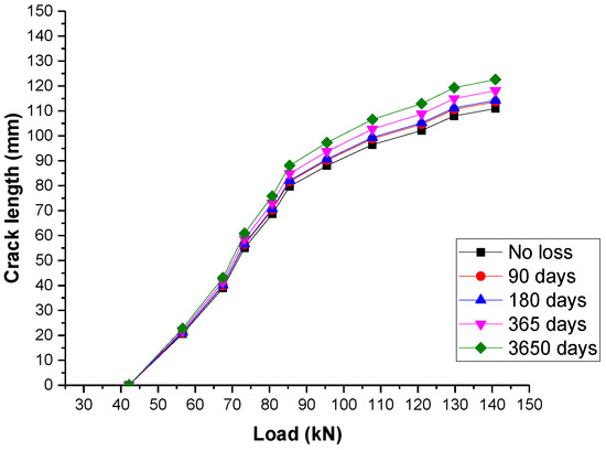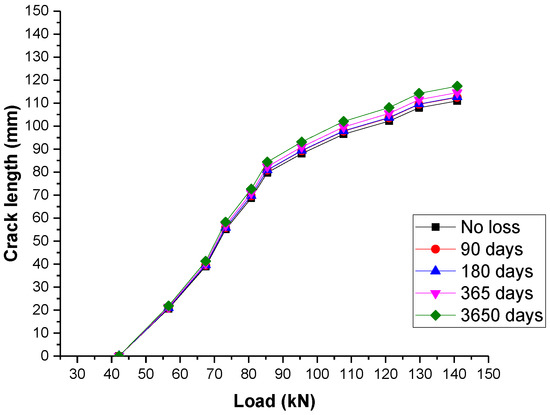 Considering the crack propagation subject to creep, the load-crack length response for the sleeper due to creep in different time is evaluated as shown in Figure 7.