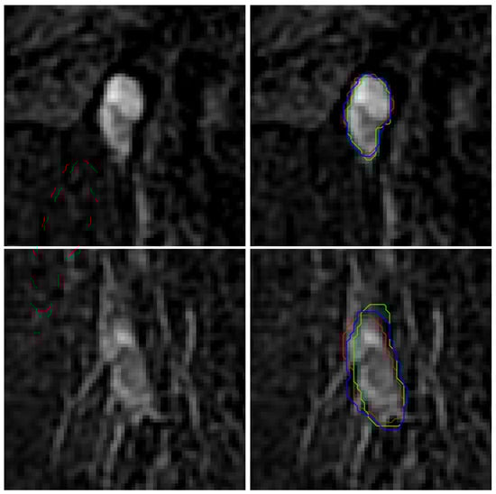 Examples related to a benign (on the top) and a malignant (on the bottom) breast mass. For each example, the DCE-MRI image area is shown without (on the left) and with (on the right) delineation contours. Segmentation results yielded by the automated delineation (red contour) and manual delineations—performed by the first (green contour) and the second (blue contour) radiologist—are compared. All figures are shown with a magnification factor.