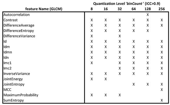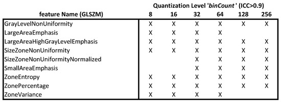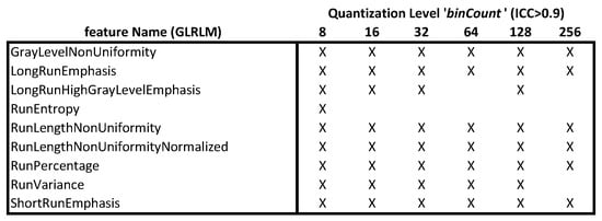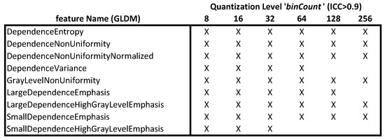 Quantization setting dependence was evaluated by means of ICC, as indicated in Section 2.4.1. In order to consider only radiomic features with excellent robustness, the cutoff value was set to . Figure 2, Figure 3, Figure 4, Figure 5 and Figure 6 show all the features—divided by category (i.e., GLCM, GLRLM, GLSZM, GLDM, NGTDM)—that obtained in at least one quantization level.