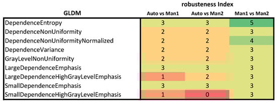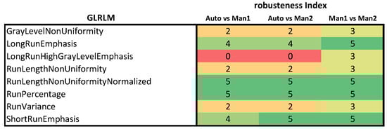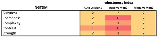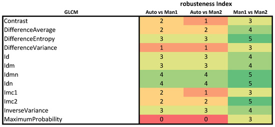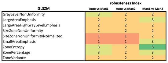Among the GLCM features, Contrast, DifferenceAverage, DifferenceVariance, lmc1, lmc2, and MaximumProbability seem to have a poor robustness, related to the segmentation method. Even if, in the comparison of manual1 vs. manual2, their robustness index is good (surely due to a higher accordance between the two manual segmentations), in the comparison with the automated method, the lmc1 is lower. This denotes a high dependence on the ROI. The category has a medium-to-high overall robustness index (0.48–0.8). Among the GLRLM features, LongRunHighGrayLevelEmphasis obtains the worst score in the comparison between automated and manual segmentations, followed by GrayLevelNonUniformity, RunLengthNonUniformity, and RunVariance. On the other hand, the other features present a very good score in all comparisons, and the overall category score is high (0.6–0.8). Nearly all GLSZM features have a medium/low index that brings the category a very low overall index, varying in the range 0.36–0.53, depending on the segmentation. GLDM almost all have a medium other score, except for LargeDependenceHighGrayLevelEmphasis and SmallDependenceHighGrayLevelEmphasis, showing an overall score in the range 0.42–0.67. Finally, all features belonging to the NGTDM category show very low robustness indexes and, consequently, the category obtains an overall score in the range 0.16–0.4.