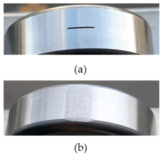 The single scratch (SS) and full scratch (FS) shown in Figure 3 were considered basic-scratch faults. The SS had a length of 10 mm, a width of 0.5 mm, and a depth of 0.5 mm. The lengthwise direction was the circumference of the outer raceway. The scratch was located at the center width of the bearing thickness. The FS was formed with a file; it was 12 mm in length, 8 mm in width, and 0.5 mm in depth.