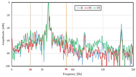 The FFT analysis was conducted using 283 U-phase stator current data obtained under various bearing conditions. First, the FFT analysis was performed for healthy motor where the bearing condition was healthy, followed by the other bearing conditions of SS and FS, respectively. Figure 4 compares the frequency spectra of the basic scratch faults (SS and FS) with that of the healthy case (H) at a rotation speed of 1765 min−1. Similarly, the frequency spectra of multiple faults at a rotation speed of 1780 min−1 were calculated for concentrated and distributed scratch faults. The amplitude was normalized so that the maximum was 0 dB. At frequencies of 30 and 90 Hz, large amplitude differences were observed depending on the bearing conditions. A similar difference was also seen in spectra obtained at other rotation speeds.