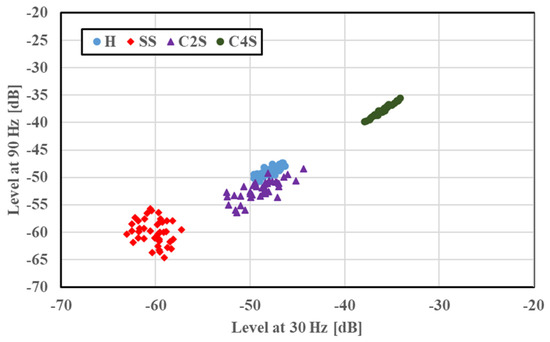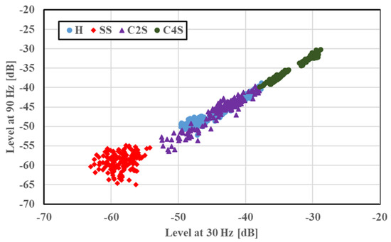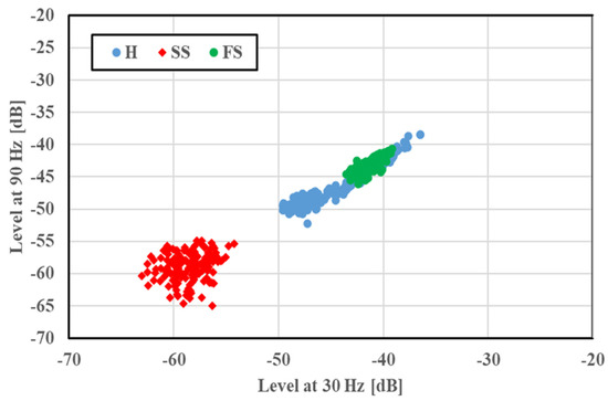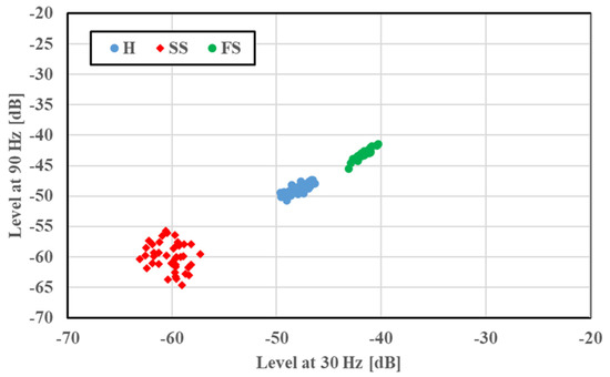 A two-dimensional display of the features was provided for fault classification; the amplitudes of the 30 and 90 Hz frequency components were plotted along the x and y axes, respectively. The feature distributions of SS and FS at 1765 min−1 are illustrated in Figure 5. Features under a given bearing condition gathered in a certain region; a small amplitude was observed in the cases of SS and FS compared with H. This case had no overlapping of distribution regions, and the fault condition was easily identified. The feature distributions of the concentrated scratch faults (C2S and C4S) at 1765 min−1 are shown in Figure 6 for a multiple scratch analysis with H and SS. The features were localized depending on the faults, and a slight overlapping was evident. For the concentrated scratch faults, the amplitude increased with the number of scratches.