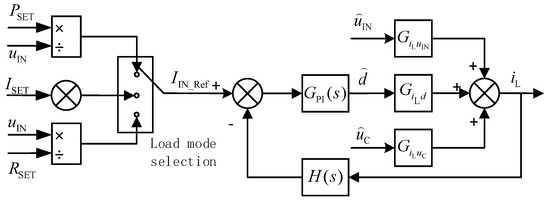 According to the test requirements and power feature of the DC power supply, only resistive loads are required during testing. Therefore, DC electronic load just has to simulate pure resistance load, not the capacitive load and inductive load. Moreover, only the three basic modes of constant power, constant current, and constant resistance are needed for load simulation [13], which can be respectively completed by making the DC electronic load’s input current IIN, equivalent resistance RL, and power output PIN equal to the set value. The control objects of different load simulation modes are different and are not conducive to the subsequent control algorithm design and control loop compensation. Among them, the current control not only has fast dynamic response but can also realize the limitation of the peak current of each cycle. Therefore, the core idea of control object normalization is to convert the control of different load simulation modes into the tracking of input current IIN. The normalized calculation formula of the control object is: