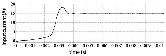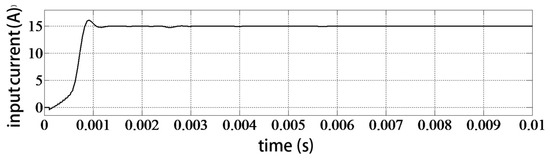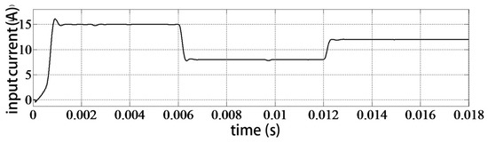In order to further study the dynamic response performance of the system when the load simulation conditions change, at 0.006 s, the reference value of the input current changes from 15 A to 8 A. At 0.012 s, the reference value of input current changes from 8 A to 12 A, and the simulation results are shown in Figure 10, Figure 11, Figure 12 and Figure 13. The adjustment time for switching from 15 A to 8 A is tS = 0.26 ms, and the minimum input current is 7.78 A. The adjustment time from 8 A to 12 A is tS = 0.23 ms, the maximum input current is 12.05 A, and the input current overshoot is only 0.05 A when switching. The results show that the load simulation control algorithm based on fuzzy control not only improves the dynamic response performance of the system but also reduces the steady-state error of the system, which is conducive to improving the accuracy of load simulation.