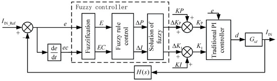 To identify the current response status of the fuzzy controller, the input current error e and the rate of change of ec as the input of the fuzzy controller and the fuzzy controller output increment of PI parameters ΔKP, ΔKI were selected. The design of the input-current-tracking control algorithm based on fuzzy control is shown in Figure 6.