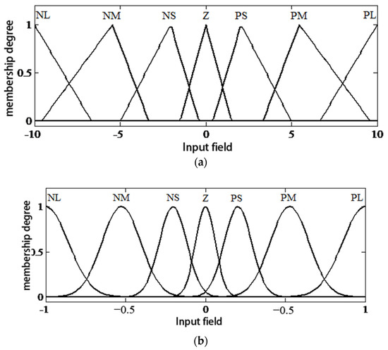 The membership functions of input E and EC of the fuzzy controller are triangular functions, as shown in Figure 7a, which have higher resolution and are conducive to improving the sensitivity of the control. In addition, output ΔP, ΔI type membership function is chosen as a normal distribution function, and as shown in Figure 7b, the change smooth feature makes the output jitter amplitude decrease, and the output control is smoother, with a higher stability of the system.