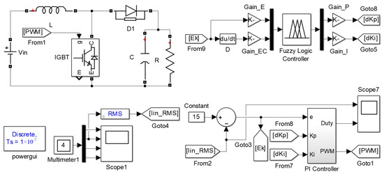In order to verify the dynamic response and steady-state performance of the load simulation algorithm based on fuzzy control, as well as the rationality of the designed fuzzy controller and the formulated fuzzy control rules, a Simulink simulation model of load simulation boost circuit control was established, as shown in Figure 8.