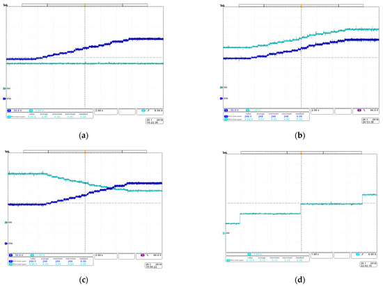 The input power of the constant power load simulation mode setting PSET constant is 1000 W. The test results are as shown in Figure 11c. With the increase in the input voltage VIN, input current IIN decreases inversely proportionally, and the change in input current is smooth, does not trigger any system protection action by accident, and in the entire process of the constant power test, the input power PIN constant is equal to 1006 W. The test results show that the simulation function of constant power load is normal and the dynamic performance of the system is good. The initial set value of input current in the simulation test of variable load is 2.0 A. During the process of the variable load test, the set value of input current is changed from 2 A to 4 A, then to 6 A after 4 s, and finally to 8 A after 4 s. The test results show that the input current IIN changes from 2 A to 4 A, 6 A, and 8 A successively. The simulation function of the variable load is normal, and multi-stage programming output can be achieved. The dynamic response of the input current tracking is rapid, and the current flow is small in the response process.