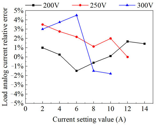 In order to further test the performance of the load simulation control strategy tracking parameter setting, the load simulation accuracy of each mode was tested. At the same time, the high-efficiency energy-fed DC electronic load studied has a wide input voltage range, and thus three input voltages of 200 V, 250 V, and 300 V were selected; through transverse comparison of the test results of the load simulation accuracy of different input voltages, the influence of input voltage on load simulation accuracy was studied.