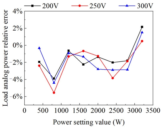 Experimental results show that the energy-feedback DC electronic load prototype has a good simulation accuracy of constant power load, and the relative error tends to decrease with the increase in power setting value, as shown in Figure 13. The maximum absolute error of input power is −92.2 W, and the maximum relative error is −5.55%, slightly more than 5% of the design requirements. At the same time, constant power load model accuracy reduces with the increase in the input voltage; this is because the design of load simulation control strategy will translate into a constant power input current tracking, with the power value at the same time, and the higher the input voltage, the smaller the input current, and the input-current-tracking error and constant power load simulation precision are also reduced.