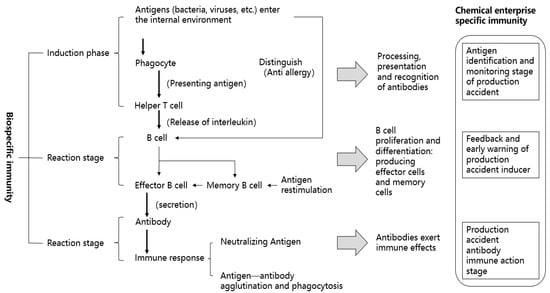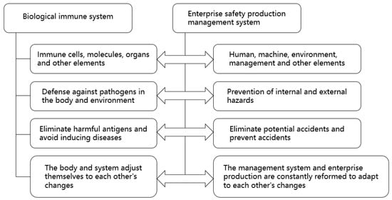 According to the immunological perspective [], the similarities in structure, object, function, and mechanism between the safety-management system of chemical enterprises and the biological immune system were compared (Figure 1). Specifically, for organization structure, the immune system is composed of immune cells, molecules, and organs, while the production management system is composed of human, machine, environment, and management. Both are sophisticated systems. For the target object, antigens in the body and the environment are the objects of the immune system, while the hazard sources inside and outside the chemical enterprise are the objects of the production management system. From the aspect of function, the basic function of the immune system is to eliminate harmful antigens and avoid diseases, while the basic function of the production management system is to eliminate the hidden danger of accidents and avoid accidents, so they have similar functions. Finally, these two systems have similar mechanisms of adaptive and constant change; the immune system adjusts to changes in the body and the body adjusts to the immune system, while the production management system adjusts and improves with the change of enterprise production, promoting the improvement of other systems in chemical enterprises. Consequently, the immune mechanism can be used to optimize the chemical enterprise safety production management model.