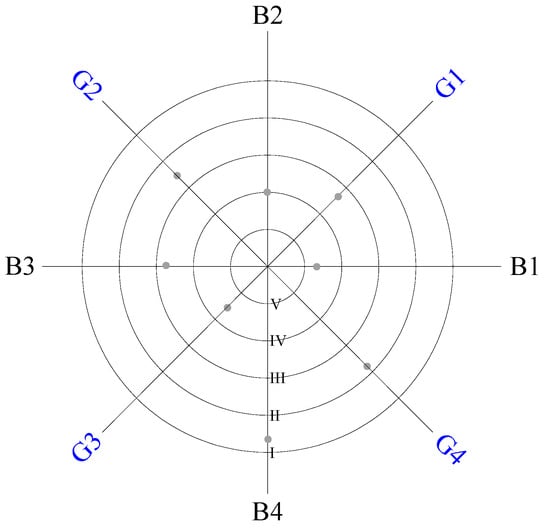 In order to achieve safe production immune maturity evaluation, a coordinate system is established according to the contribution of immune factors (B) and antigenic factors (G), and the energy level diagram of accident-inducing immune factors is thus drawn in Figure 3. The center of the circle is the core of the immune system, and the outside of the circle is the external environment. According to the contribution of the immune factor to the immune system (the combined antigen–antibody score value), it is divided into five levels: initial level I [0.0, 0.2], defined level II [0.2, 0.4], repetition level III [0.4, 0.6], continuation level IV [0.6, 0.8], and optimization level V [0.8, 1.0]. For the immunity factor (B), the closest internal level V has the highest energy level, indicating the better safety status of the chemical company. The outermost energy level I is the lowest, which is also the highest hazard level. The further away the accident immune factor is from the control target (center of the circle), the lower the degree of control of the antigen by that antibody, i.e., the lower the energy level. For the antigenic factor (G), which induces harm, the energy level diagram is interpreted in the opposite way. Thus, the degree of control of the incident immune system over the harmful factor (antigen G) depends on the positional state of the corresponding immune factor (antibody B), with each antibody being independent, interrelated, and mutually constrained.