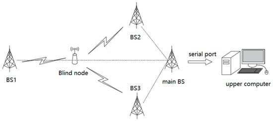 The tag will exchange information with three base stations at the same time. Finally, the packet containing the label address, base station addresses, and signal propagation times will be sent to the upper computer, and the actual location coordinates of the tag will be calculated according to the information. Based on the base station location and signal flight time, the tag position can be solved by establishing a mathematical model. The Chan positioning algorithm is a most widely used positioning solution method based on TDOA, which can calculate high-precision position coordinates with a small amount of calculation. If the coordinates of three stations are , then the distance between tag and base station is , k = 1, 2, 3. The tag coordinate to be obtained is , then,