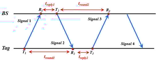 where, r is the search radius. In order to reduce the time error between transmitter and receiver, as well as the influence of clock drift on the calculation accuracy of time difference, the symmetric double-sided bidirectional ranging method is adopted to obtain the signal time of flight (Figure 9). When the positioning system is turned on, the positioning tag sends the matching signal to the nearby base station in real time. If a base station is idle, it will send an initialization signal to the tag, and then the positioning tag is paired with the base station. The tag will then send a signal to the base station containing the address of the base station and record the time T1. When the base station receives the signal with its own address, it will record the receiving time T2 immediately, and after a certain time delay, send the response signal to the tag, and record the sending time T3. After receiving the reaction signal, the tag immediately records the receiving time T4. After a certain time delay, the final signal is sent to the base station, and the sending time T5 is recorded. After receiving the final signal, the base station records the receiving signal time T6, and calculates the two time differences, treply1 = T3 − T2, tround1 = T6 − T3, and sends the packet containing the two time difference to the tag. The tag can also calculate two time differences according to the recorded timestamp, treply2 = T5 − T4, tround1 = T4 − T1, and the propagation time of the signal between the tag and the base station can be calculated according to the two time differences sent by the base station, as shown in Formula (8).