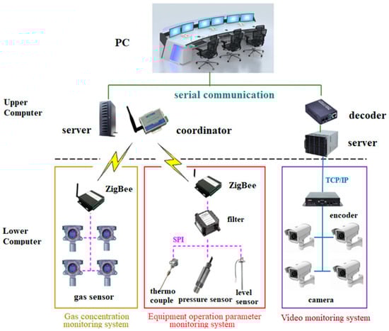 In view of the above demands, the framework of a visual monitoring platform is shown in Figure 10, including two parts, the upper computer and the lower computer. The lower computer is mainly used for parameter monitoring and video picture acquisition, which is divided into gas concentration monitoring system, equipment operation parameter monitoring system, and video monitoring system. Through the data transmission system, the real-time monitoring data will be aggregated to the upper computer. The upper computer is mainly composed of a server and a monitoring PC, which stores and processes the relevant data monitored by various monitoring equipment in real time, and displays them in real time on the screen.