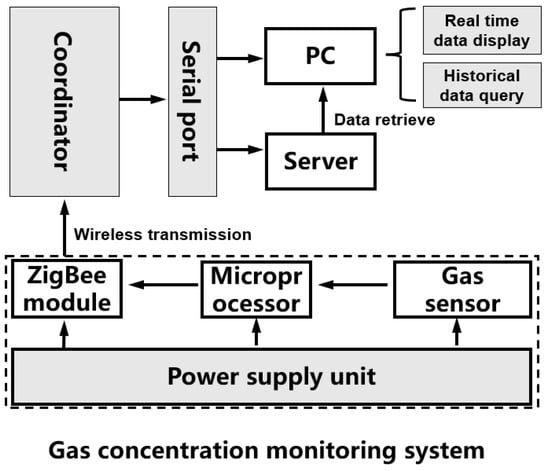Based on gas sensors and ZigBee wireless transmission network, a gas concentration monitoring system for real-time monitoring of toxic gas is established, including various gas sensors, a ZigBee module, a microprocessor, and a power supply unit, as shown in Figure 11.