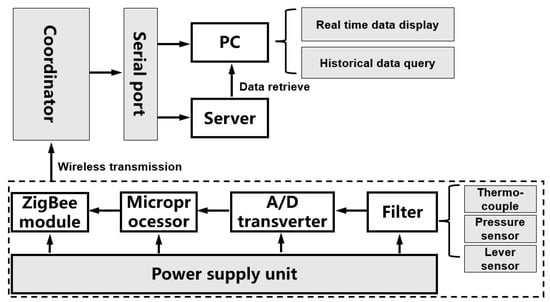 Temperature, pressure, and liquid layer are the most vital parameters in equipment operation, which need to be monitored in real time to help safety management personnel grasp the real-time changes of relevant parameters. The operation parameter monitoring module consists of sensors, filters, AD transverters, microcontrollers, and a ZigBee module, as shown in Figure 12. Due to the complex working environment of the sensor, the output signal is usually small and easy to be disturbed. Therefore, it is necessary to use the filter to effectively filter and amplify the signal to obtain more accurate monitoring data. Compound filtering method is adopted to process the measured signal, that is, n sampled values are sorted from large to small, with deleting the maximum and minimum values, the arithmetic average value of the remaining n-2 values is obtained, which comprise the final data. The filter then transmits this signal to the AD transverter, which converts the processed analog signal into digital signal, and then the microcontroller encodes the digital signal and packages the data. Parameter monitoring data packets are also sent to the server through ZigBee module, and the server stores and processes the data packets. Finally, the PC software extracts data from the server through serial port and displays various parameter values in real time.