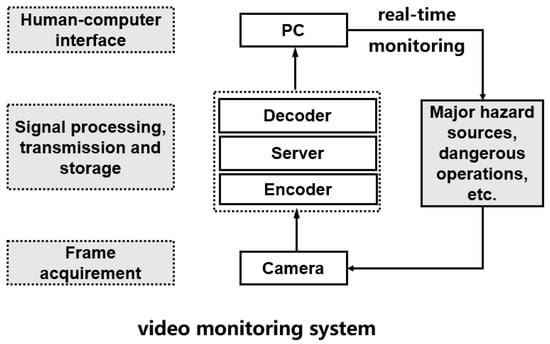The video monitoring system of chemical enterprise should have the functions of instant transmission of video signal and data tracking, so as to realize the real-time monitoring of chemical production processing and retrieve historical data in case of emergency. A video monitoring system consists of a camera and a video coder, as shown in Figure 13. The camera first converts the collected video signals into digital signals, and sends them to the video encoder for compression and coding, and then transmits them to the server for storage. After decoder decoding, the PC can display the video picture.