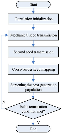 - Competition-based elimination: The population size of a specific region is limited by . When the population size reaches the upper limit, elite seeds are retained, and redundant seeds are randomly eliminated. The number of elite seeds is calculated using Formula (9).