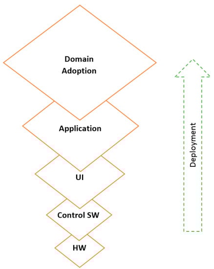 Despite the potential perception of the different development areas being discrete processes, it is important to understand that during the development, these areas of development are interlinked and intertwined. In Figure 1, there is a two-way information flow between upper layers and lower layers, so in the development process, for instance the application development process may inform and put requirements on the lower levels of user interaction development and SW and HW development. Indeed, the development process is iterative with iterative technology specification and development, and in upper layers together with people in their real world environment.