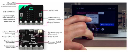 Two of the three programming modalities of the GrowBot. (Left): The BBC micro:bit is a small IO module based on the Nordic nRF microcontroller. (Right): Programming on the 5″ touch display on the GrowBot.