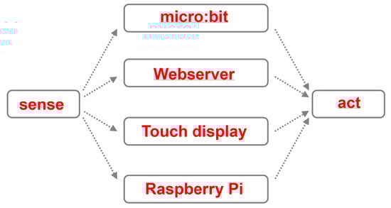 This allows for a control architecture inspired by the subsumption architecture known from behavior-based robotics [,]. Here, a number of parallel processes all have access to the sensors and actuators (in contrast with the old-fashioned AI robotics control with one centralized controller). In our case, we may have four control processes accessing the sensor data and controlling the actuators, namely the default (Raspberry Pi) (Potentially, the default behavior could be viewed as part of the Touch display control, but here for the (educational) clarity of the subsumption architecture, we define the default behavior as a separate control of the Raspberry Pi), the Touch display, the webserver, and the micro:bit, as shown in Figure 6. Although it is evident that all control processes can have access to the sensor data in parallel, the other side of the access to the actuators needs more careful coordination, since two processes cannot both control a particular actuator at the same time. Therefore, the behavior-based robotics research has proposed several behavior coordination methods. These behavior coordination methods include suppression, action selection, voting, behavioral fusion (e.g., vector summation), etc. Here, we will find inspiration in the suppression method, which simply is a priority-based coordination that a priori assigns a priority of importance to the different processes. In our case, the processes will have increasing priority from the lowest of default Raspberry Pi up to the highest of the micro:bit in Figure 6.