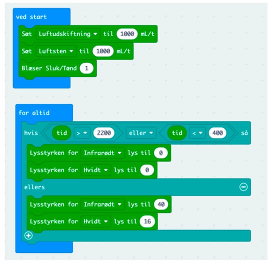 For allowing the GrowBot to be controlled by the micro:bit, we defined and developed a number of blocks for the Makecode environment. These blocks, called ‘Groblocks’, can be imported in the Makecode environment. They allow the user to control with the various sensors and actuators of the GrowBot. An example of a simple control program for the micro:bit made in the Makecode environment can be seen in Figure 8. In this case, at the start, the air change of the chamber and the air pump for the oxygen disk is set to 1000 mL/h and the fans are set to on (1). A time condition is made so that during night between 22:00 and 4:00, the IR light and the full spectrum light are set to 0, whereas in the other time interval during the day, the IR light is set to 40, and the full spectrum light is set to 16.