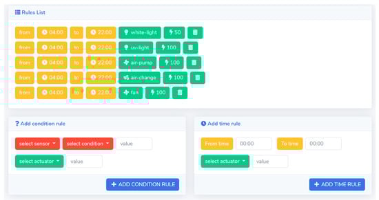 Finally, the GrowBot provides the option to develop rules and programs on the webserver so that the user can program and edit the control programs remotely on the webserver and then, from the remote access, transfer these for control on the physical GrowBot. The remote access control will be enhanced further in future developments of the GrowBot. Figure 9 shows the simple webserver rules editor with a number of time rules.