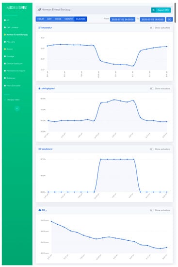 In order to monitor the status of the GrowBot, the user can interact with the GrowBot through the touchscreen display and through the remote webserver interface. On the display, the user can get simple information on the current value of the sensors: temperature, humidity, CO2, and water level. This might be information, which is good to easily be able to see when physically present next to the GrowBot, so it is shown on the front page of the display on the GrowBot. On the webserver interface, the user can get more extended information including the current and historical data of the sensors in graph form, photos from the RGB camera, and information on when actuation commands were performed on the GrowBot. In the graphs, the user can select to see data from the last hour, the last day, the last week, or from a user-defined time interval. The users can also toggle between the photos taken by the RGB camera each 8 h (and possibly make their own still motion video of the growth happening in their GrowBot, and program the camera to take photos at other time intervals). Additionally, on the webserver, the users can export all the data in CSV-format for further analysis in their preferred software such as Microsoft Excel. Figure 10 shows an example of part of the webserver interface for monitoring the sensor data. Here, the temperature and humidity data for one day (24 h) is shown, and the representation in graph form makes it easy to recognize how the temperature drops from 11 p.m. until 5 a.m., and the humidity rises in the same interval. In this case, this corresponds with actuator commands to turn off the lights at 11pm and turn on the lights at 5 a.m.