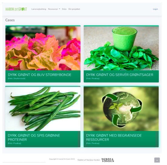 On the web-page (in Danish), users can easily select a case of interest. Clockwise from upper left corner, the cases are translated to “Grow green and become an urban farmer”, “Grow green and serve vegetables”, “Grow green with limited resources”, and “Grow green and eat green proteins”. Under each case, there are 15–20 educational tasks related to the theme of that case.